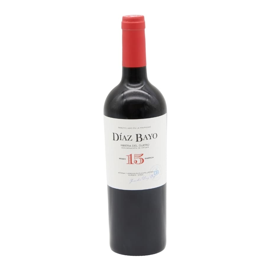 Vino elaborado únicamente con uvas de la variedad Tinta del país. Con un paso por barrica de 15 meses, se muestra frutal en nariz, con recuerdos de fruta negra, cacao y regaliz. En boca, Díaz Bayo 15 resulta sabroso, largo y agradable.